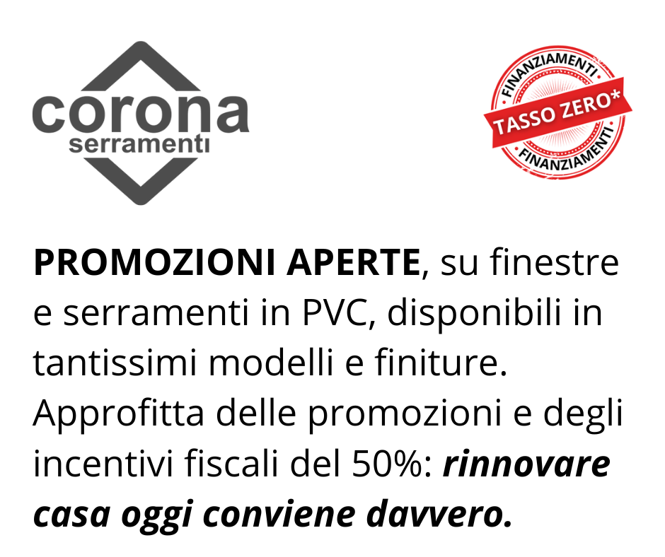 Con Corona1925 puoi sostituire i tuoi vecchi infissi con serramenti in PVC di alta gamma, progettati per migliorare l’isolamento termico e acustico e la sicurezza della tua casa, aumentando il comfort abitativo e riducendo i consumi energetici.